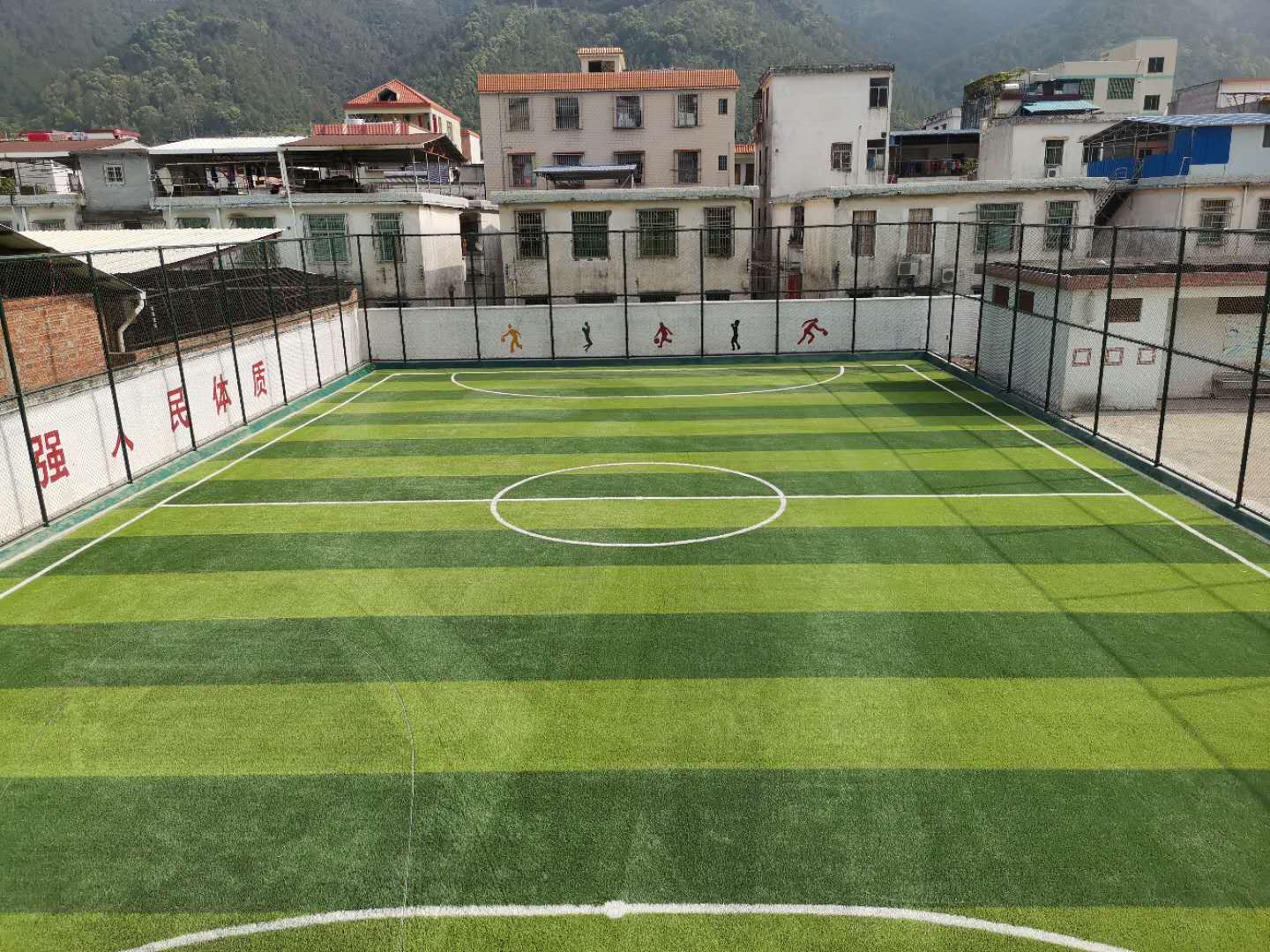 铺装简便,打开粘好即可使用,适用于室内外各类足球场地。如今被广泛推广的笼式足球场模式,更加适用铺装免填充型足球草,它的维护更为简便,不需要清理因运动而溢出的颗粒也不需要进行补充和梳理,具有可移动的特性。